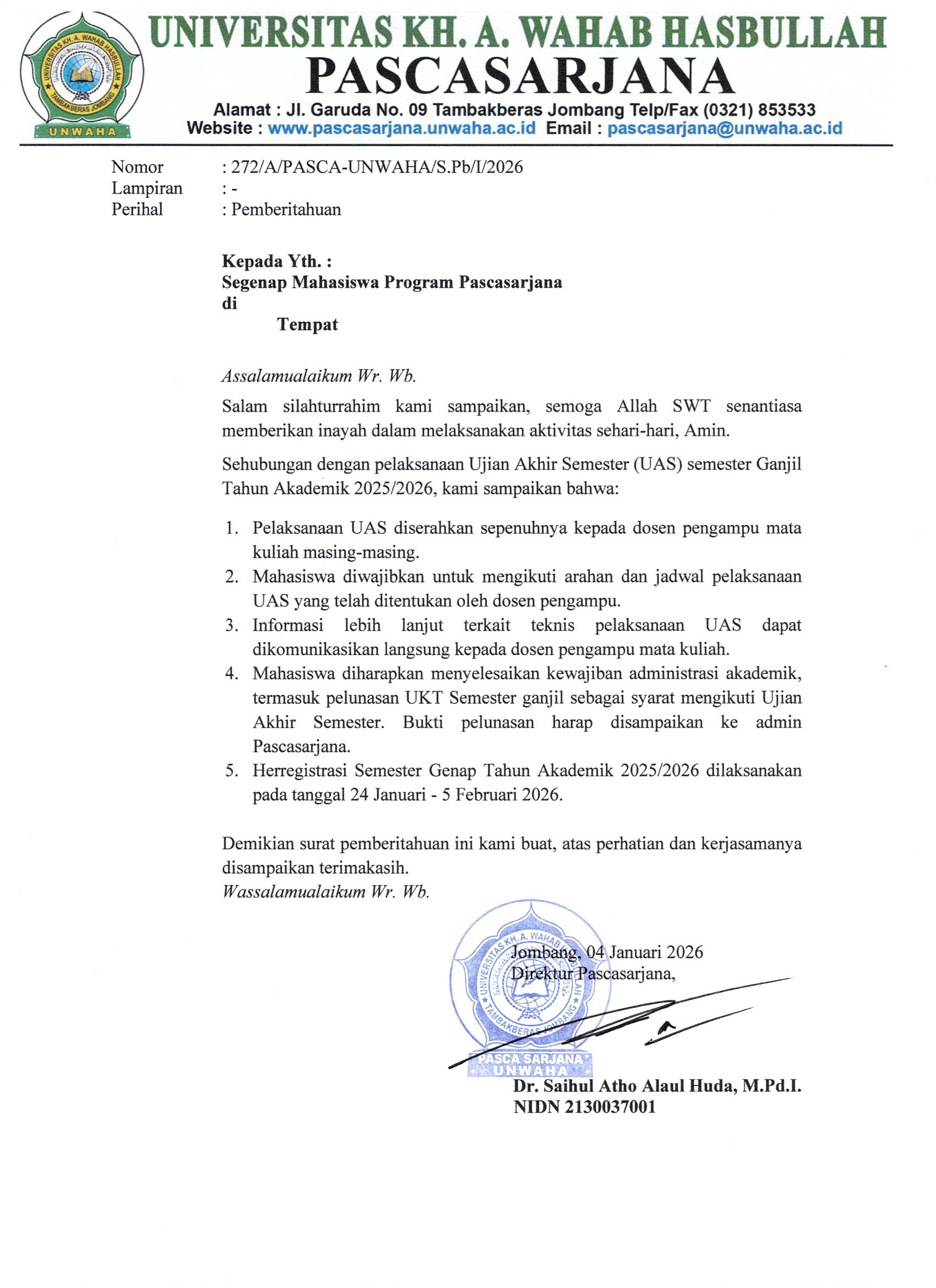 Diberitahukan kepada seluruh mahasiswa Pascasarjana bahwa pelaksanaan Ujian Akhir Semester (UAS) Semester Ganjil Tahun Akademik 2025/2026 dilaksanakan sesuai ketentuan yang berlaku. Informasi selengkapnya mengenai jadwal, tata tertib, dan teknis pelaksanaan UAS dapat dilihat pada surat edaran berikut. klik disini